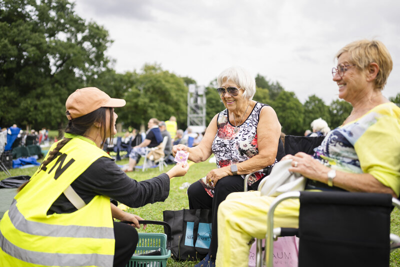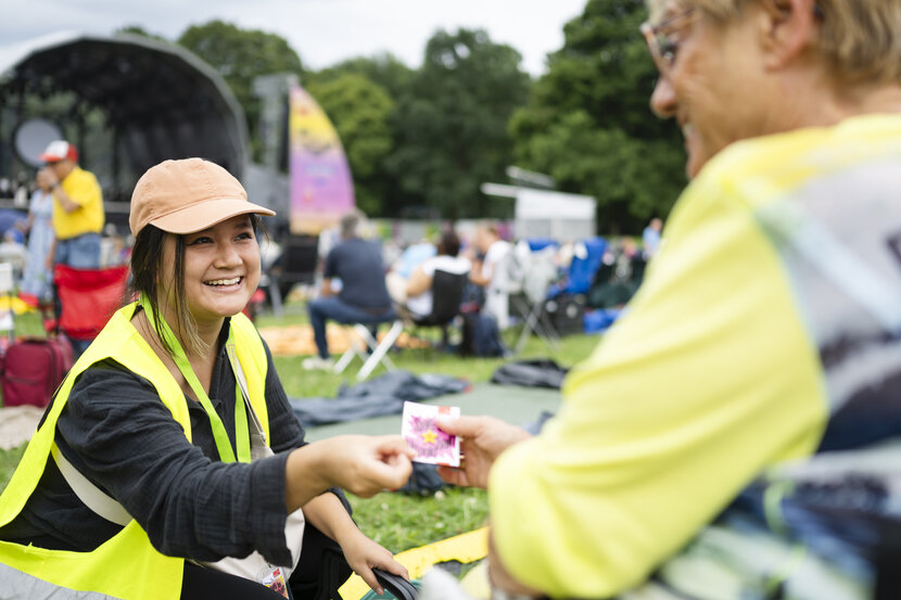 So kann man die Pins erwerben: Auf dem Luitpoldhain-Gelände sind freundliche Verkäuferinnen und Verkäufer unterwegs - ganz leicht erkennbar an den gelben Westen. Des Weiteren sind die Pins auch an jeder Infobude erhältlich.